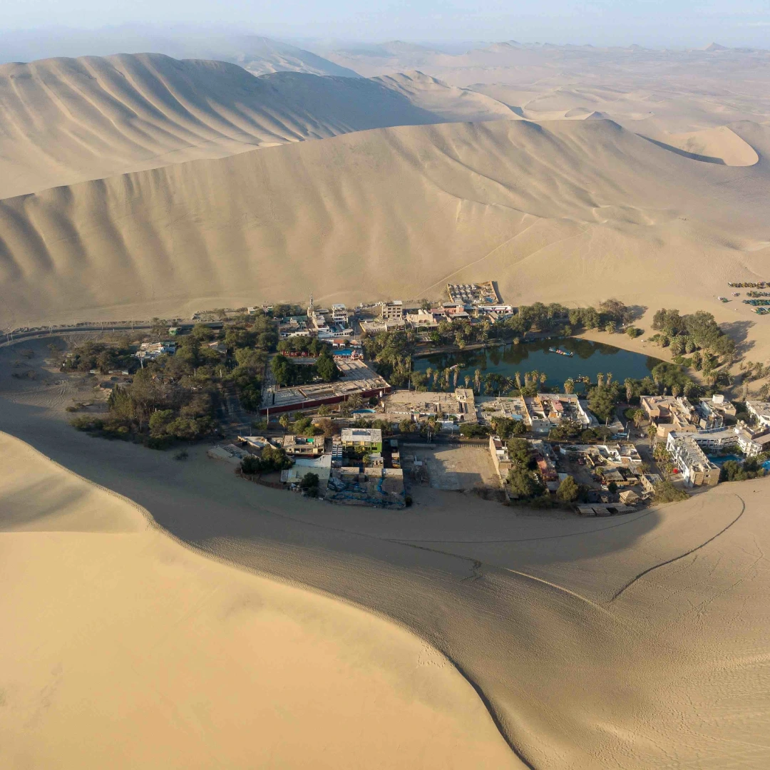 Arrive at the natural oasis of Huacachina, surrounded by giant dunes and lush vegetation. Free time to explore, photograph the oasis, or relax before the adventure tour.