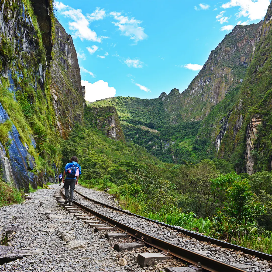 After lunch, we’ll trek alongside the railway tracks toward Aguas Calientes. During this scenic walk, we plan to stop at the small Intihuatana ruins and enjoy spectacular views of the towering Machu Picchu and Huayna Picchu mountains.